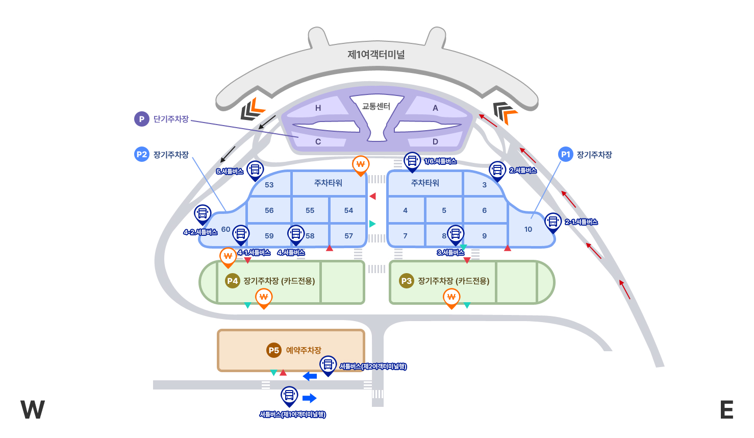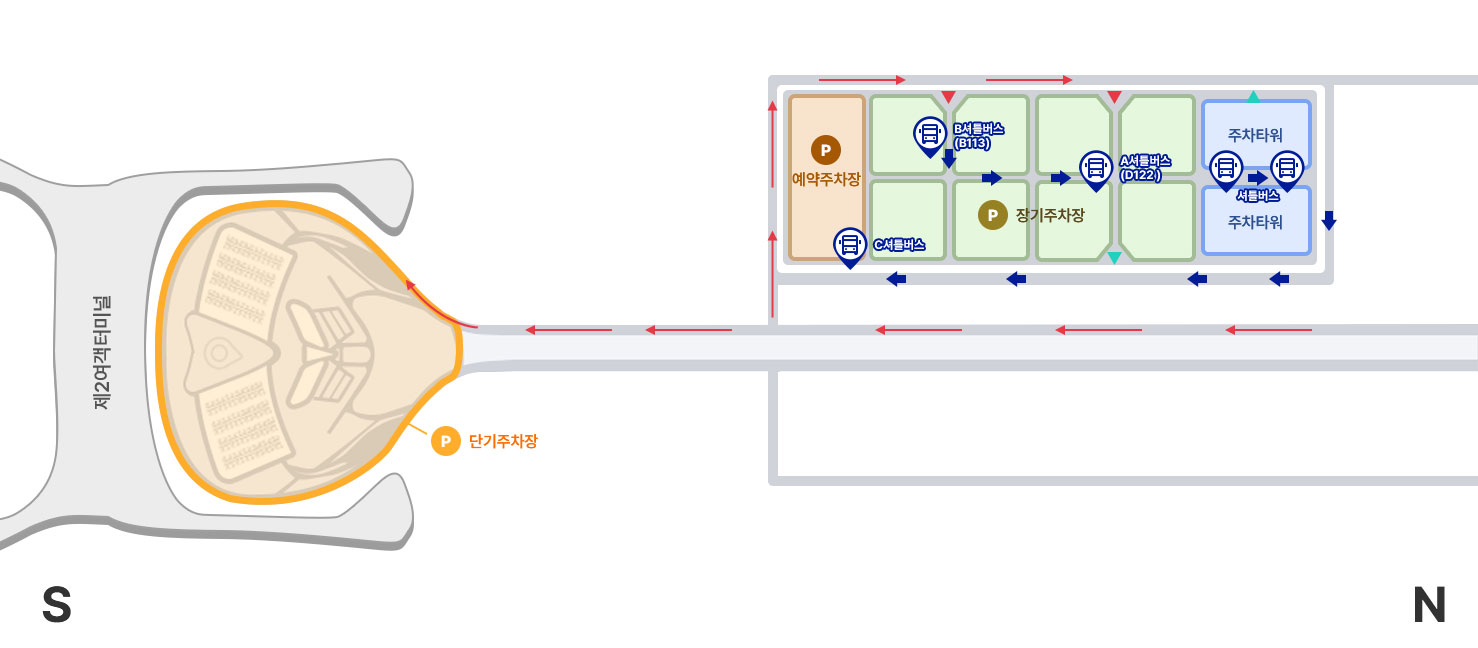 - 제1터미널 예약주차장에서 00:00 ~ 05:00 사이에는 셔틀버스 운행이 중단되어 도보로 이동해야 할 수 있음