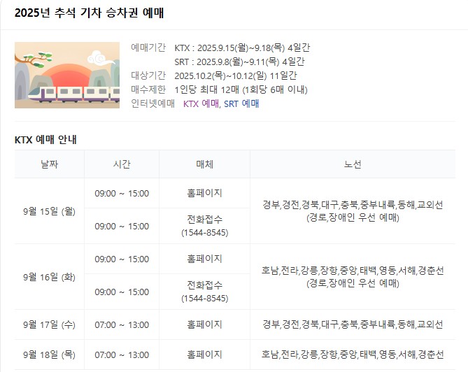 아래는 2025년 추석 연휴 KTX 예매 관련 일정과 팁을 정리한 내용입니다. 추석은 10월 5일(일)–10월 8일(수) 이어지고, 이를 포함해 **10월 2일(목)부터 10월 12일(일)**까지 총 11일간의 황금연휴가 이어집니다