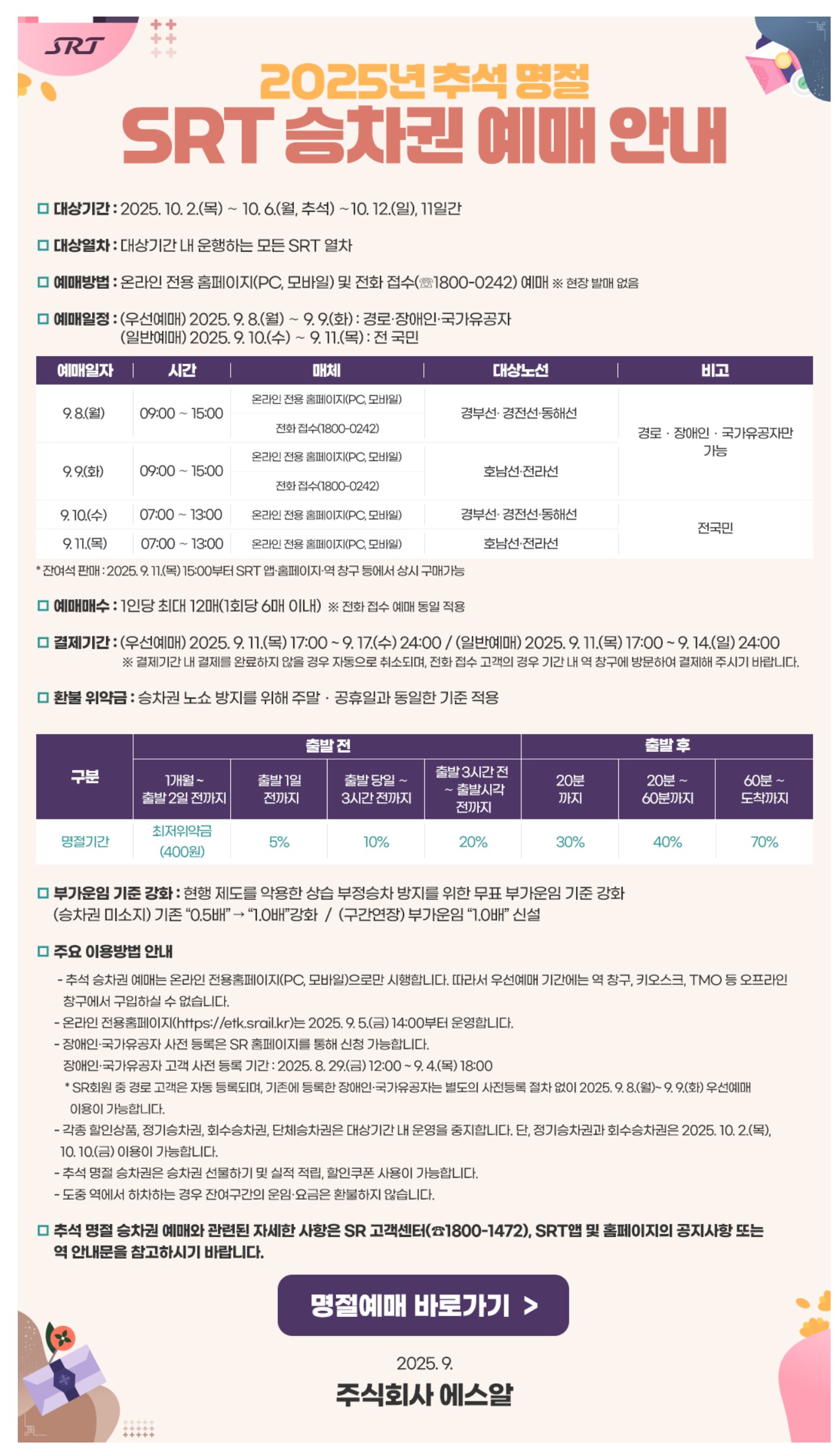 아래는 2025년 추석 연휴 SRT 예매 관련 일정과 팁을 정리한 내용입니다. 추석은 10월 5일(일)–10월 8일(수) 이어지고, 이를 포함해 **10월 2일(목)부터 10월 12일(일)**까지 총 11일간의 황금연휴가 이어집니다